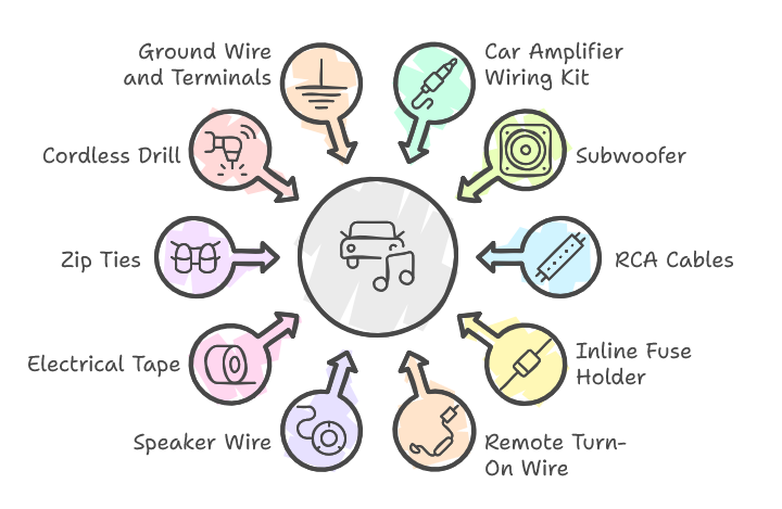 (Quick answer: You’ll need a car amplifier wiring kit, subwoofer, RCA cables, fuse holder, speaker wire, and basic tools for a clean and safe install.)